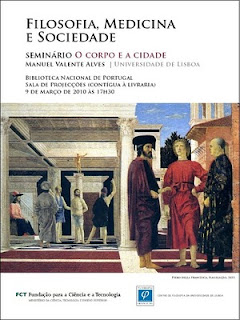 Na próxima sessão do Seminário "Filosofia, Medicina e Sociedade", que decorrerá no dia 9 de Março, terça-feira, às 17.30, na sala de projecções da Biblioteca Nacional de Portugal, Manuel Valente Alves, médico e artista, apresentará uma Comunicação sobre "O Corpo e a Cidade", que será comentado pela historiadora de arte Giuseppina Raggi.